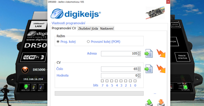 Takto programuji jakýkoukoliv DR4018 na kolejišti bez nutnosti jejího odpojování od kolejiště. Důležité je mít při nastavování CV zadánu v aplikaci adresu 9999 a aktivovat tlačítkem na nastavované DR4018 programovací režim.