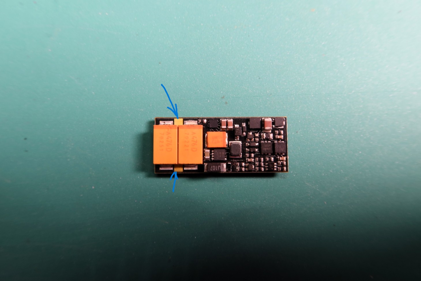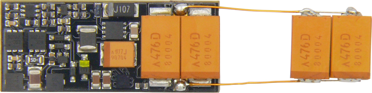 Yes, I know there is no bottom view of the MX658N18 in our MX-decoder manual, describing these two solder pads, which only MX658N18 revision B have (so the first hardware revision A of the MX658N18 don´t had these two additional solder pads). These two solder pads can be used to connect addition capacity directly, so for example two more 47µF/20V tantals (see picture attached) are fine - if there is not much free space left is in the model. One of these solder pad is simple ground, the other solder pad is a kind "elco plus" solder pad … you just a voltage limitation there of about 16V … so even if your track voltage is higher than 16V (unlikely in case a typical gauge N or TT layout, but possible) only up to 16V are put there.