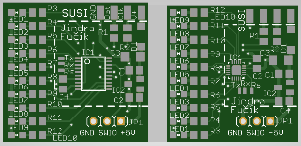 Já jsem v rámci nějaké výukové aktivity udělal příkladovou knihovnu pro Arduino, která ukazuje implementaci podřízeného dekodéru s použitím mimořádně levného procesoru CH32V003 od firmy WCH (pro zajímavost, cena procesoru začíná už na dvou korunách za kus). Procesor se dá koupit v prostorově efektivním pouzdře QFN20, které je vhodné do lokomotiv menších měřítek (klidně i do N), nebo třeba v pouzdře TSSOP20, které se zase velmi dobře zpracovává v domácích podmínkách. Součástí knihovny je i několik příkladů použití, včetně příkladu funkčního dekodéru, který ukazuje jak lze vytvořit dekodér s několika funkčními výstupy a to buď přímo a nebo směrové závislé.