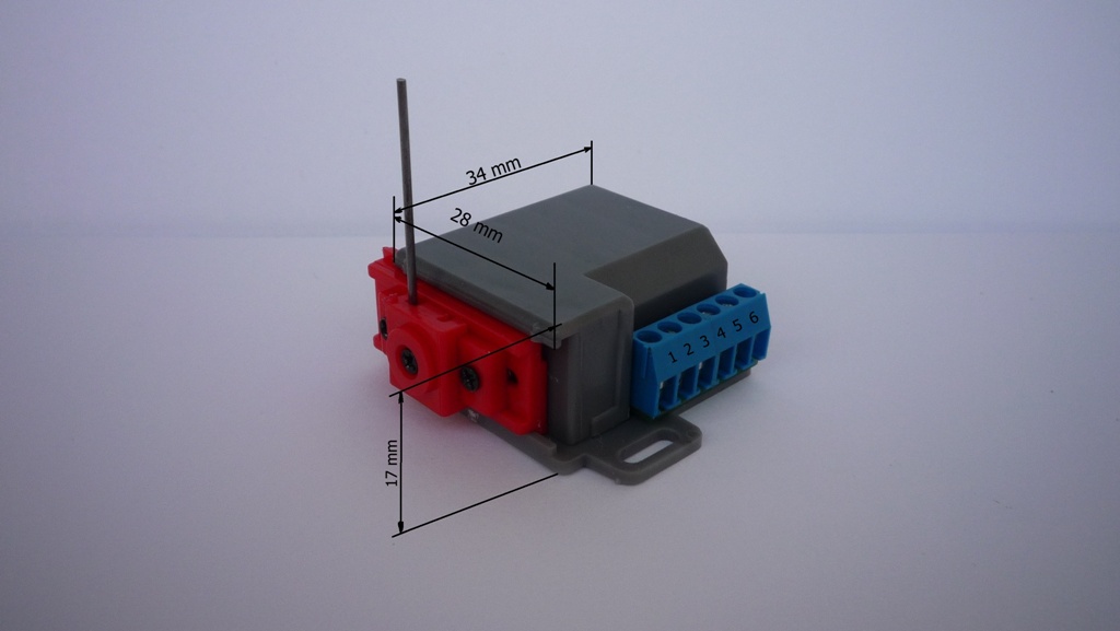 Na další fotce jsou rozměry + zapojení. Kótována šedá krabička obalu přestavníku - tj. rozměry + připočítat červenou pohyblivou část 5mm. Osová vzdálenost upevňovacích děr (montážních otvorů) je 35mm.
