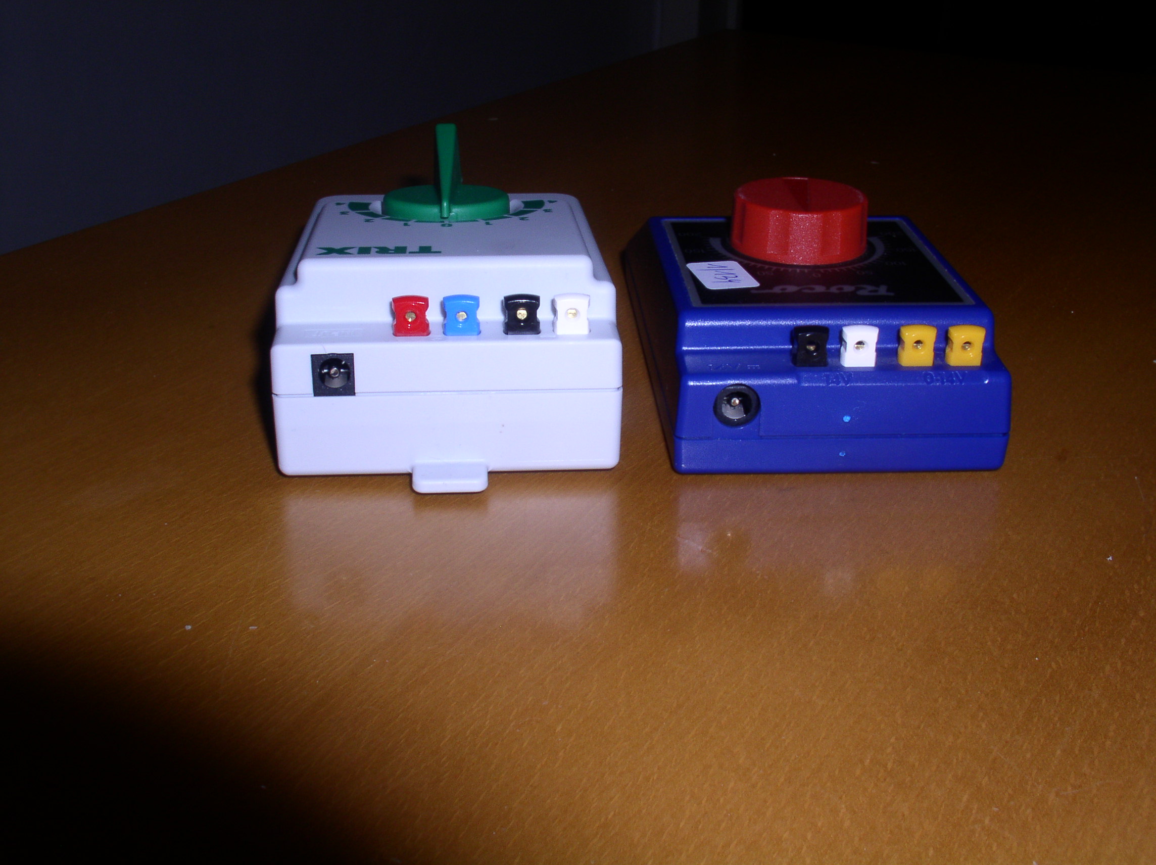 K modrému regulátoru vpravo (ROCO 10788) jde připojit všechny transformátory, které jsem doma našel. K tomu šedému vlevo (Trix 190956) žádný. Jaký rozměr konektoru potřebuju?