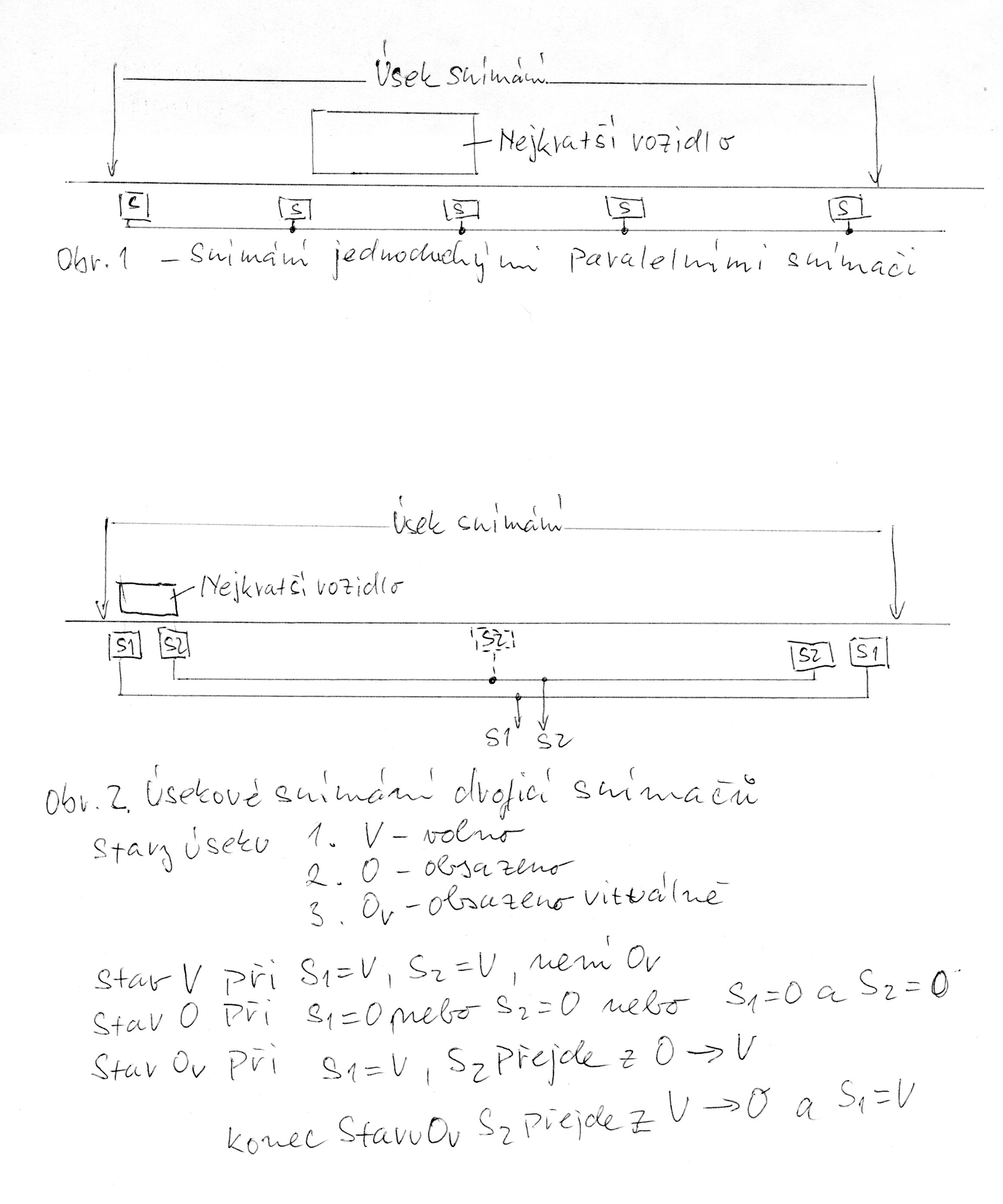 Na obrázku 2 je úsekové snímání. Na bránách jsou vždy dva detektory, vnější a vnitřní. Ty jsou na všech vjezdech/výjezdech z úseku paralelně propojené. Toto zapojení je schopné detekovat vjezd jednoho vozidla (soupravy) do úseku a držet obsazený úsek až do jeho výjezdu. Tento stav jsem nazval na obrázku "Obsazeno virtuálně". Vozidlo může vjet libovolnou branou a libovolnou branou zase vyjet. Pro ty případy, kdy vjede souprava do úseku, odpojí se některé vozy a zbytek vyjede, je nutné instalovat vnitřní snímače na té části úseku, kde bude zbytek soupravy stát, jinak by se úsek po odjezdu první části soupravy uvolnil.