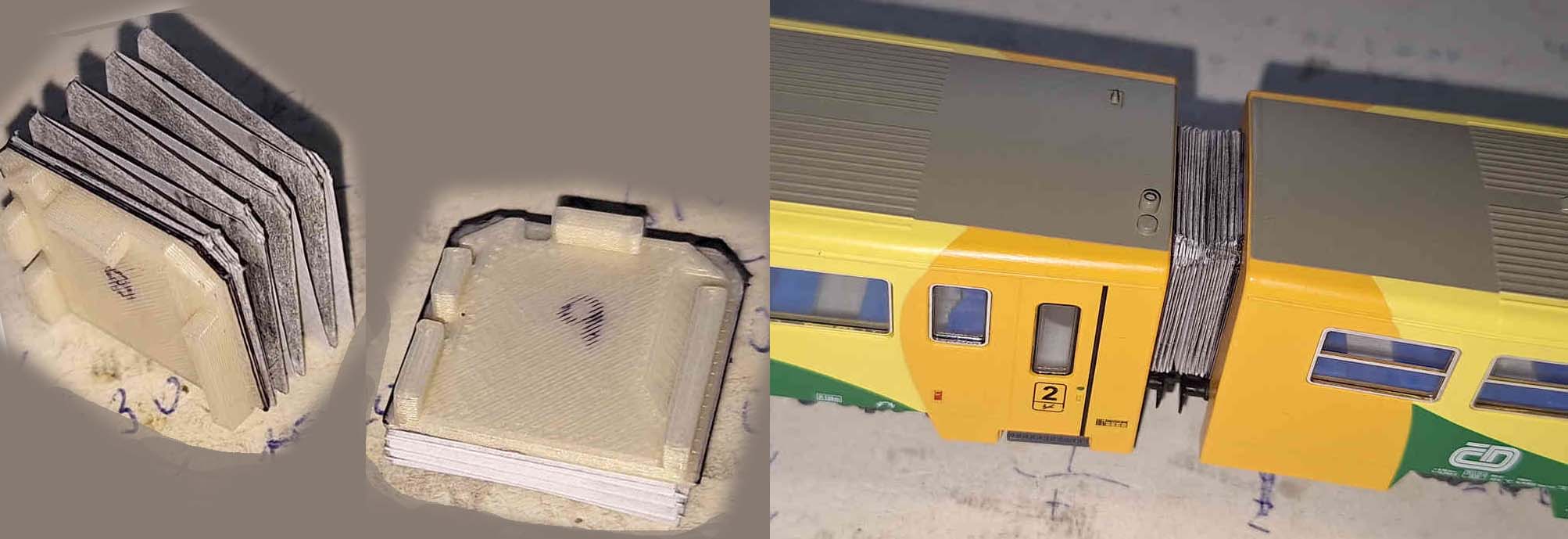 Taky se mně nelíbil přiložený gumový přechodový měch. Udělal jsem papírové skládačky, nalepené na destičky, vytisknuté na míru do otvorů ve vozech. Bez lepení k vozům, jsou jen vsunuté. Měch by měl být šedý, neměl jsem šedý papír, tak jsem bílý zašedil pastelkou. Neodstraňoval jsem ty cupliky, pro gumové měchy, na destičkách jsem pro ně nechal místo. S původním propojovacím káblikem, už počítáno není.
