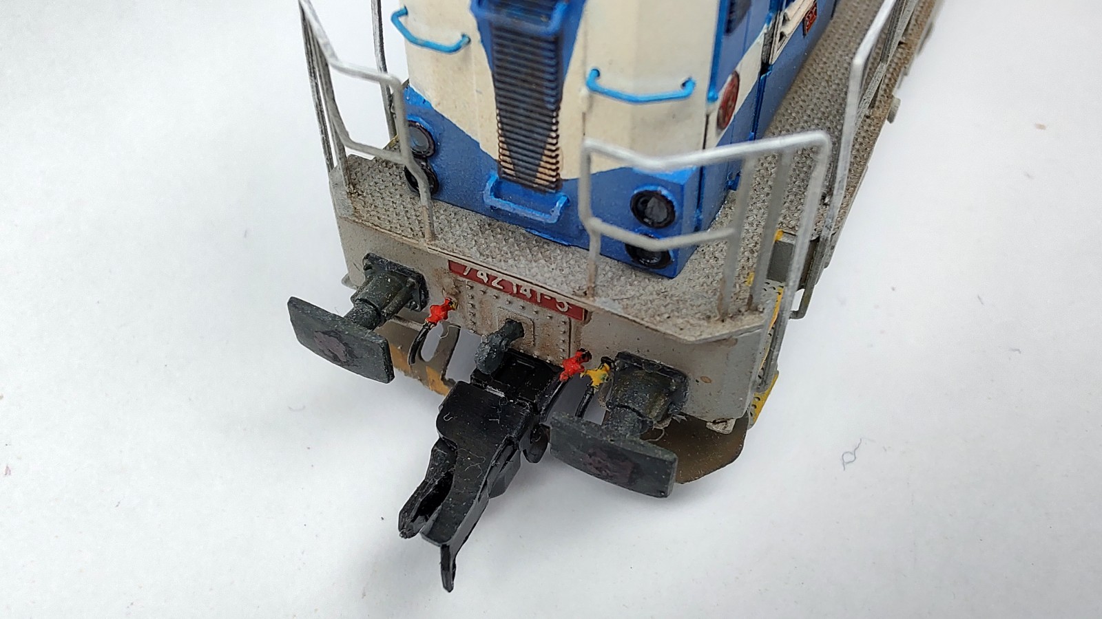 Tady je vidět, že spřáhlo je zase téměř naražené na čelník - šachta přes čelník přesahuje asi 0,5 mm, ale i to stačí ke spolehlivé funkci. Nos na západce musel jít tentokrát celý pryč. Odměnou je modelové spřažení, mezi nárazníky jsou asi 2 mm a souprava projede i oblouky pod R250 mm.