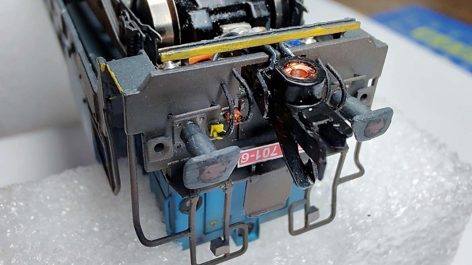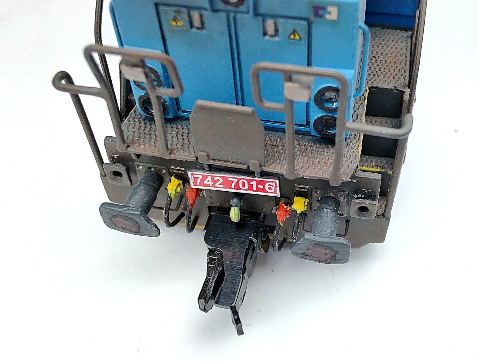 Tohle byla větší výzva - pojezd je vlastní konstrukce a namísto kinematiky je tam jen otočná šachta Peho. Navíc, v čelníku, který je krásně plochý a robustní, není žádný otvor, kudy provléct vodiče ke spřáhlu a rozhodně jsem tam žádný další dělat nechtěl. Nakonec jsem vodiče provlekl mezi traverzou a čelníkem, i když jsou natěsno, lehce se hýbou. Otočná šachta má zezadu magnet, který přitahuje ocelovou kuličku, zalepenou v šachtě. Tak jsem tam ještě jeden magnet (2x2 mm) přidal, aby se šachta vrátila i přes odpor vodičů.