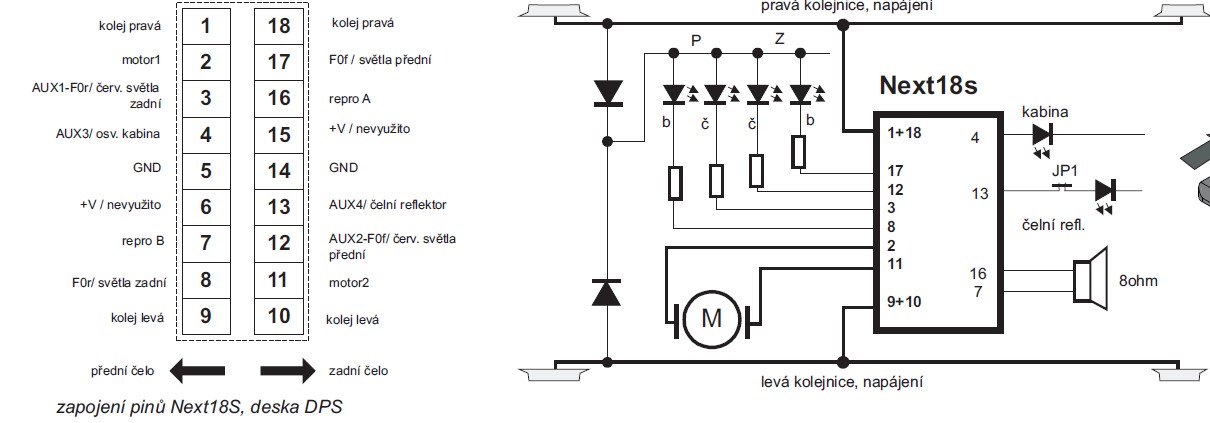 Zapojení ala Jirka Zlámal využívá jeden výstup, tady asi AUX1 (červená světla zadní), zapojení obou červených LEDek odpárat a zapojit přes tranzistory na 17 (F0 front) a 8 (F0 rear) za účelem zachování logiky svícení.