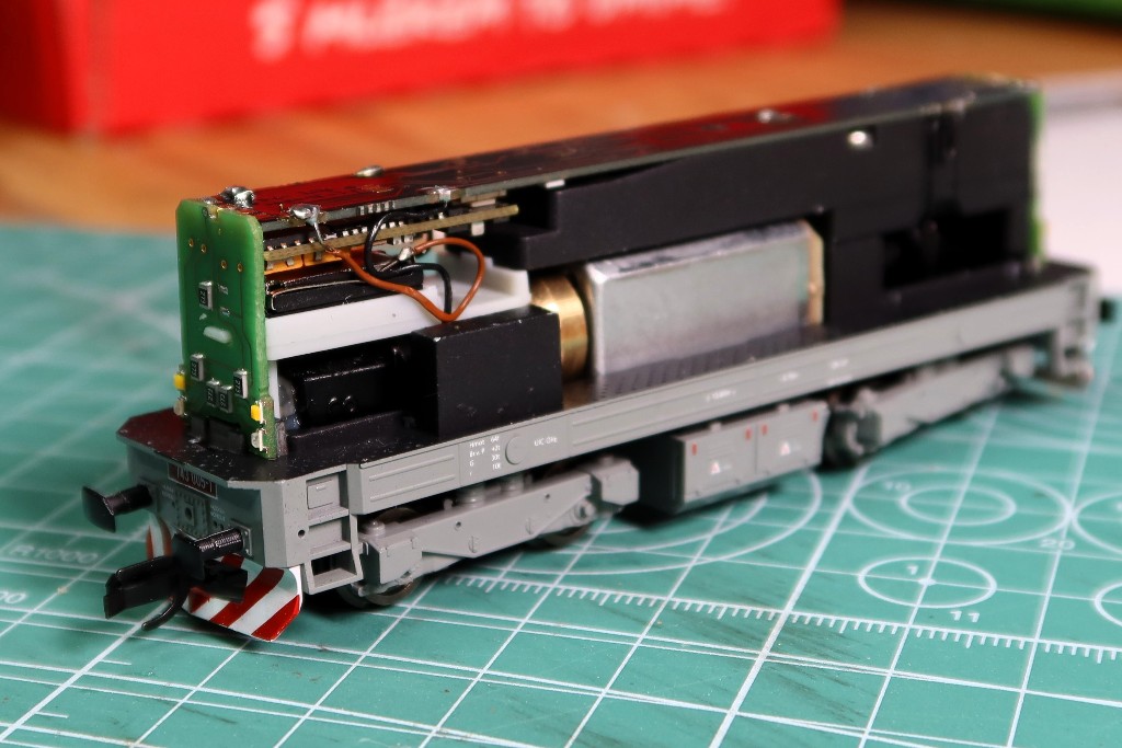 Je to tam dost narvané. Trochu místa je mezi dekodérem a ozvučnicí (vlevo). Vodiče od spřáhel by se musely protáhnout kolem podvozků, kde to je natěsno. Musel bych napřed vyzkoušet, zda to nebude blokovat rozsah otáčení podvozků. Nebo vrtat a frézovat jako PB.
