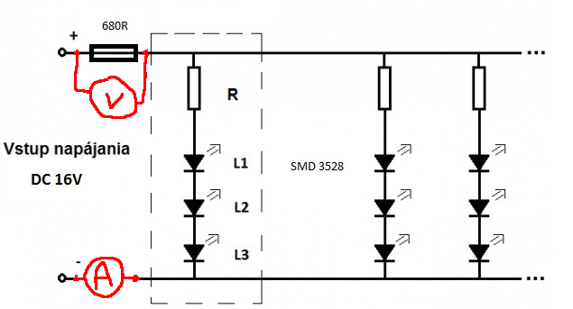V kolajisku nameranych 16,1V a led pasik je, ze ani diva svina nevie, ale z ciny led su SMD 3528.Je ich 60 na meter. Neviem, kolko moze mat ten 28cm pasik watov.. Mozno snad 2W, ale berte ma s rezervou. Prave preto sa pytam, ze ci to ten metalicky rezistor vydrzi. Tych 680 ohm je vyhovujucich. Svieti to tak akurat.
