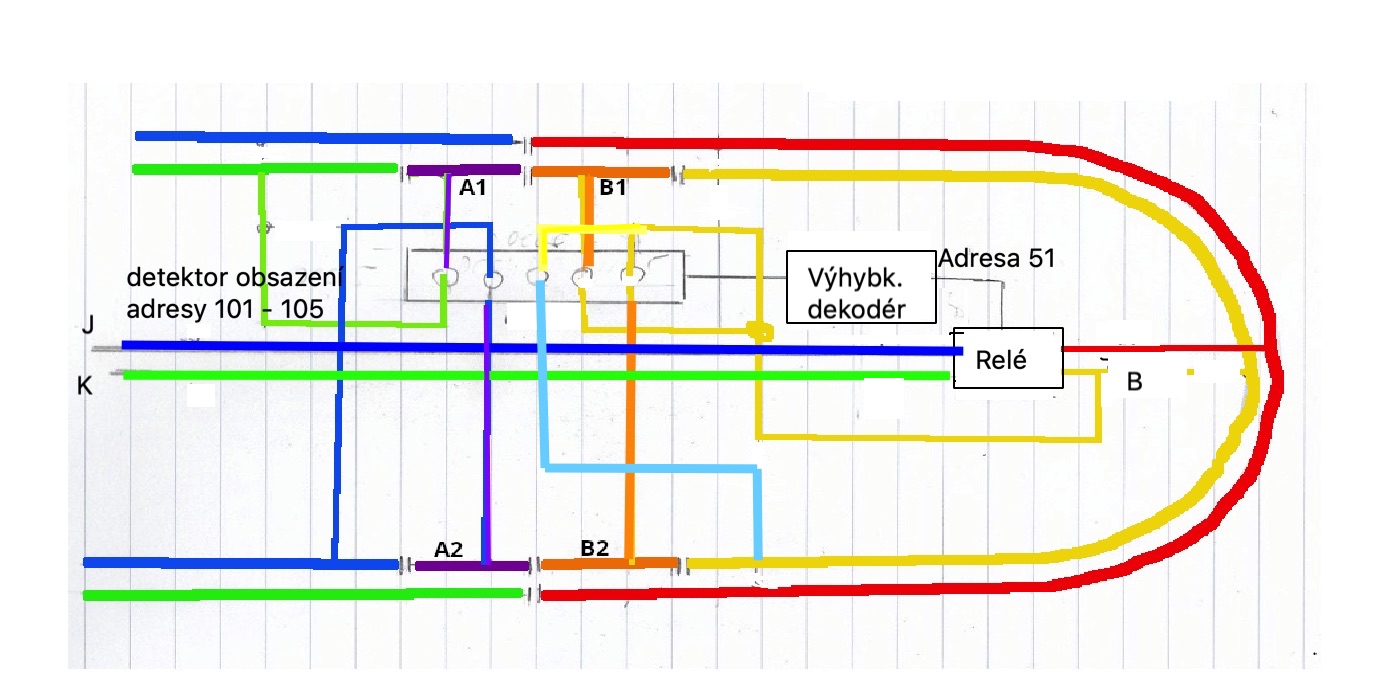 Konkrétní příklad je na následujícím obrázku. Je použit pětivstupový detektor obsazení Occupation 5. Na rozdíl od obvyklých dekodérů obsazení, u nichž je obvykle jeden pól společný pro všechny detekované vstupy, jsou u tohoto dekodéru u každého detekovaného vstupu oba póly nezávislé, což je u detekce smyčky nezbytné.
