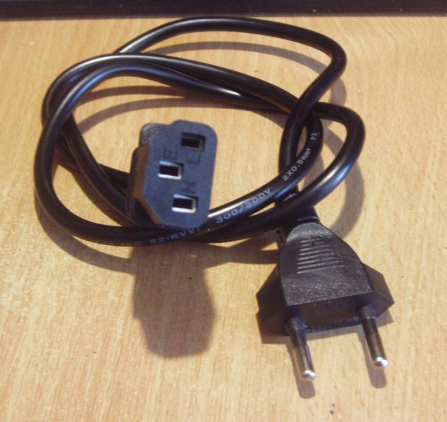 BohousP píše:Uřízni tu třípólovou vidlici a dej tam dvoupólovou zásuvku (na obr.). Tak to poslouží bez problémů. Pro zdroj použi klasický pc napájecí kabel.