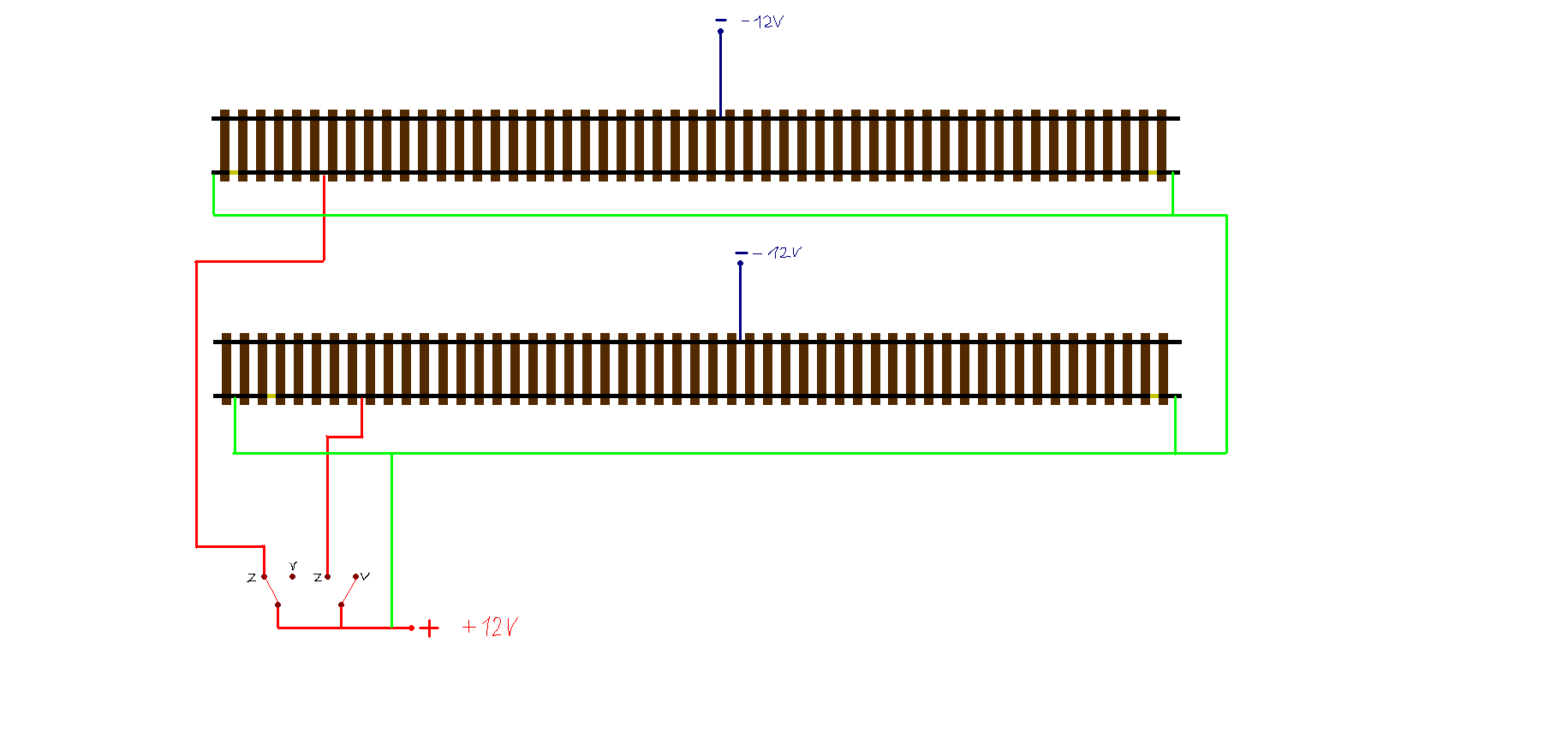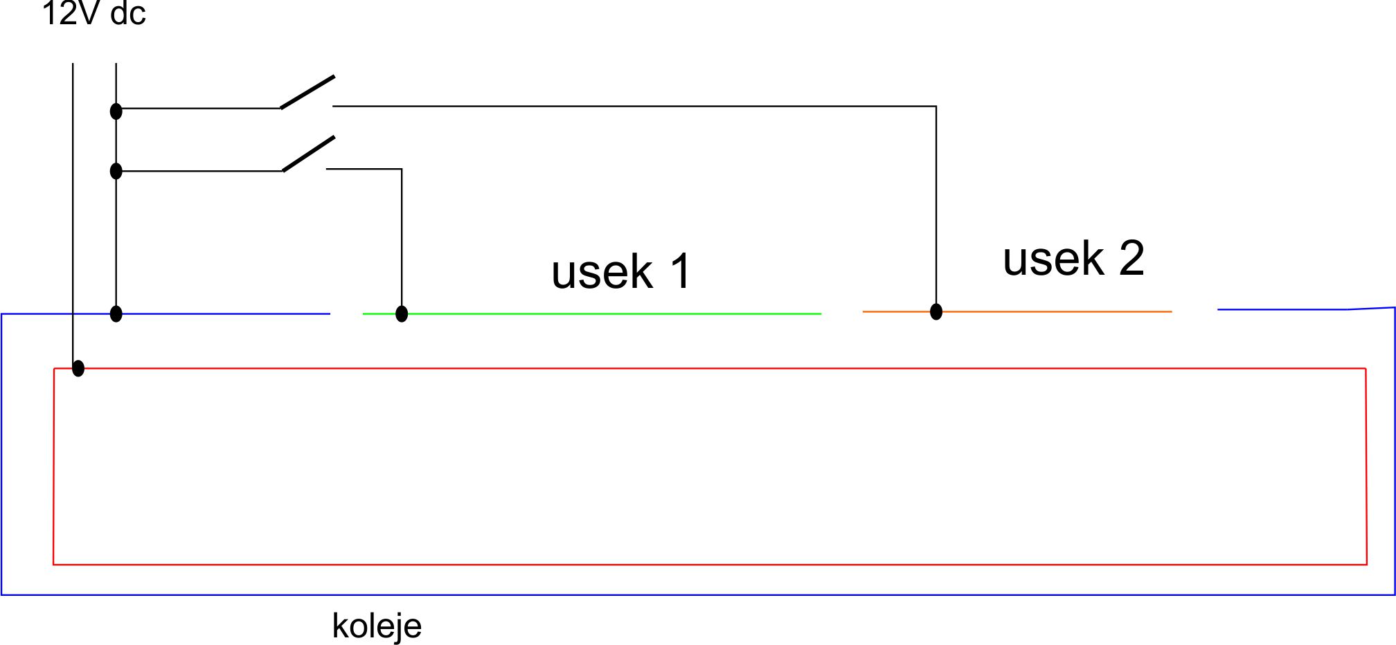 zkus to nakreslit tak, aby tam byly obě kolejnice a bylo vidět kde a která je přerušená. A také vyznač, kde připojuješ napájení a kde máš připojené vypínače pro ty úseky.