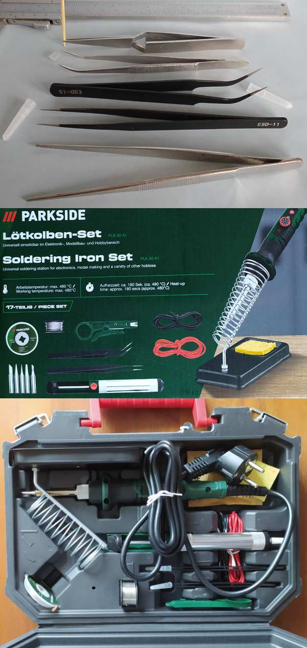 Stály sice tyto dvě jemné pinzety v kauflandovém doprodeji celkem 250 Kč, jenže spolu s nimi k tomu byl :--) zároveň i kufřík z pružného plastu, páječka s pracovní teplotou nastavitelnou v rozsahu 200 až 480 st. Celsia a s dvoubarevnou indikací (nahřívání + dosažení požadované teploty), 6 různých výměnných pájecích hrotů, stabilní celokovový odkládací držák-stojan, pájecí houba, malá cívka pájecího cínu (bezolovnatého), odsávačka cínu, měděné pletené odsávací lanko, dvě izolovaná lanka, odizolovací nožík, kvalitní detailní návod a jako bonus 3letá záruka.