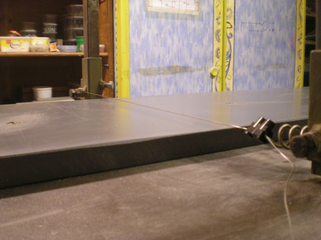 Ahoj, jiz delsi dobu jsem chtel rezacku poradne vyfotit, protoze v dilne na to nejsou moc dobre svetelne podminky, ale dam sem alespon par nekvalitnich fotek. Rezacka je udelana jako mobilni stroj (pridaji se k ni nohy), umi rezat vodorovne i svisle a to i v uhlech. Rezat se stim daji plotny na cca 1mm minimalni tloustku. Co se tyce sirky rezu, tak ten styrodur co je tam polozeny je cca 20cm siroky. Cim je ten rez delsi, tim pomalej se musi jet a tim vice se ma snahu drat houpat. Musi byt hodne naply a i tak rezat celou plotnu tj.50cm by byl asi problem.