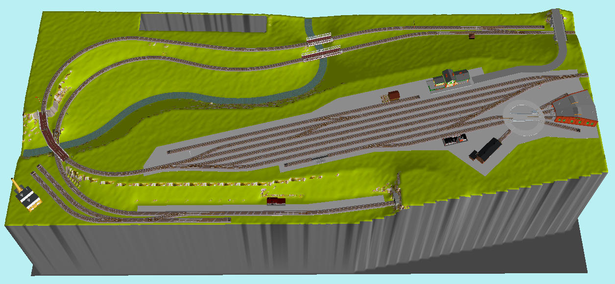 tu řeku jsem zkoušel podle kresby, ale vznikne ti tam Grand Canyon a vypadá to... divně. Přeci jen stanice je 6,5 cm nad úrovní spodní tratě a řeka nemůže být hned v úrovni spodních kolejí. Takže ze strany stanice bude kolmý sráz do řeky vpředu i vzadu hned za poslední kolejí a hned bude zase další trať. Působilo to na mě jako obří vodní příkop kolem dokola kolejiště.
