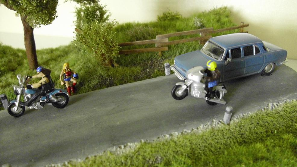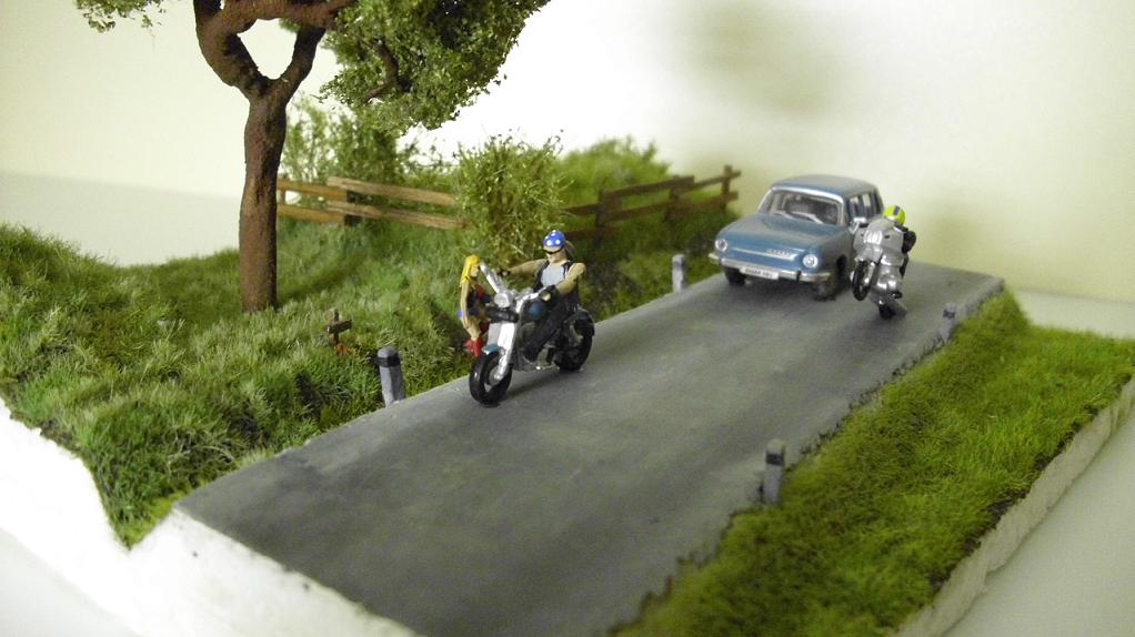 Řekl bych, že jsem dioráma "zdárně" dokončil. Dioráma jsem pojal dle zdejšího nápadu, aby jeden motorkář předjížděl auto na zadním kole. Abych zdůraznil jak je tento kousek nebezpečný, znázornil jsem malý pomníček u silnice a ženu jak jde od pomníčku. Shodou okolností je žena také motorkářka. Pravděpodobně u stromu zahynul její bratr, nebo partner ? Výsledek mé práce si můžete prohlédnout zde: http://mizl.rajce.idnes.cz/Diorama_2012