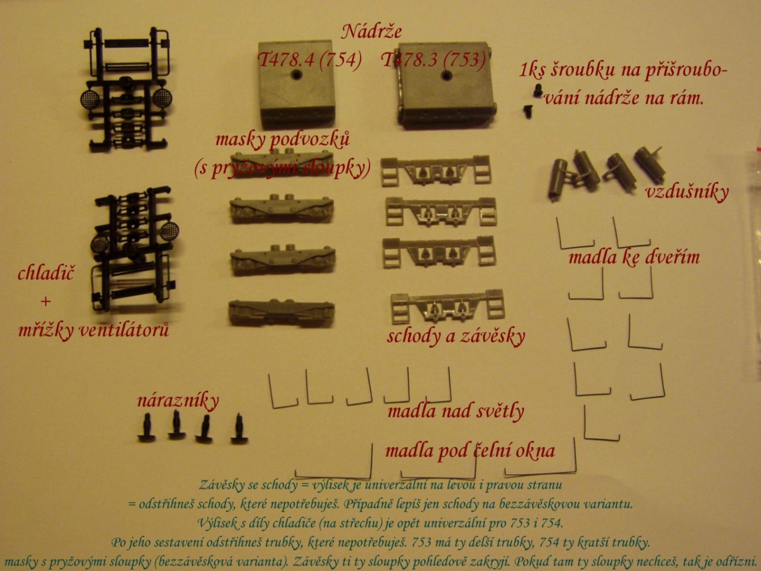 Výlisek s díly chladiče (na střechu) je opět univerzální pro 753 i 754. Po jeho sestavení odstřihneš trubky, které nepotřebuješ. 753 má ty delší trubky, 754 ty kratší trubky. Díry pro chladič na střeše nejsou naznačeny z důvodu jiného umístění u 753 a 754.