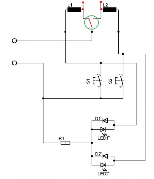 Přes vinutí cívky a odpovídající sepnutý kontakt přestavníku protéká proud do obvodů pouze jedné LED diody. Po přestavení přestavníku se sepnutý kontakt rozepne a sepne se rozepnutý kontakt druhé cívky – rozsvítí se druhá LED dioda, první zhasne. Vždy svítí ta z nich, kde budeš spínat přepínač, proto je musíš na panelu opticky prohodit, aby ukazovala polohu vyhybky a ne kam se bude příště vyhybka přestavovat. To je jen ovšem detail.