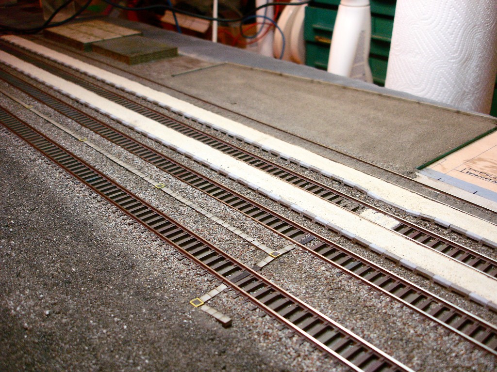 Hrany jsou zasypány v prostoru ke koleji. Finální zásyp povrchu nástupiště provedu až po instalaci přechodů a dokončení rozhraní nástupiště/budova. Až následně, jak bude vypadat celek, bude se zesvětlovat, ztmavovat, špinit, ladit, a tak.