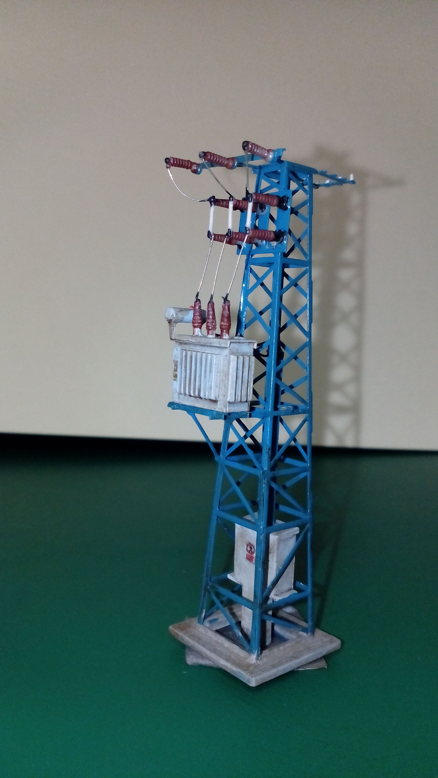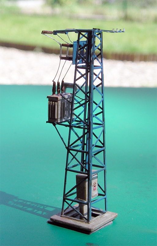 Ještě bych celou konstrukci stříknul matným lakem. Moc se leskne. Ve skutečnosti bývá vlivem slunce a deště matná (a světlá, vyšisovaná), pokud ji teda nenatírali zrovna minulý měsíc. Vyjímkou jsou izolátory, které jsou keramické (aspoň myslím) a glazura jim lesk zachovává.