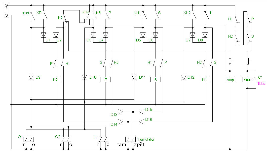 3) Vlak 2 dojede do H1. Koncovým kontaktem KH1 přestaví všechny výhybky opět do polohy "odbočka", sepne relé S a to rozepne relé P. Úsek S se připojí na napětí odpovídající polarity a vlak 1 odjíždí zpět do H2.