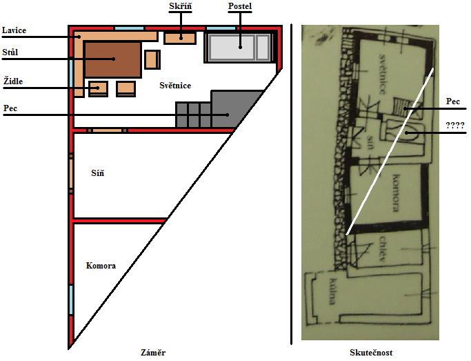 Napadlo mne .... Co pojmout domek jako sídlo bohatšího statkáře na místo klasického vesnického statku ?? Ti přeci byli bohatší a tím pádem si mohli dovolit i oddělit místnost na spaní a obývací (společenskou ) místnost. Kuchyně by potom byla také oddělená.