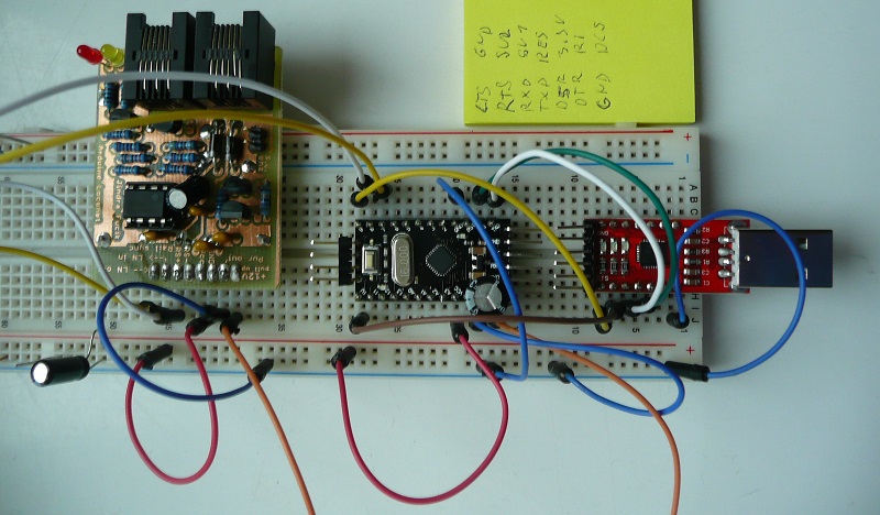 Teď je otázka, jek udělat propojení s PC. Jedna možnost je, vzít MAX232 a udělat z nich RS232 port. To se mi v dnšní době zdá jako blbost, takže jsem to ani nenavrhoval. Druhá možnost je vzít desku, které má na sobě převodník USB seriál, ale tyto desky nemají propojené piny RTS/CTS z tohoto převodníku směrem k procesoru. Pro mne se zdá být celkem dobré řešení vzít kousek drátku a propojku si dodělat. Převodník je v pouzdře SSOP-20, takže to není žádná trága. Ale ozvalo se tu pár lidí, že se jim nechce pájet na svém arduinu a že mám tedy použít desku, která má převodník externí a použít propojky. Takže jsem se rozhodl pro Arduino Pro Mini a vnější převodník. Takže na konci je zhruba takovéto zapojení: