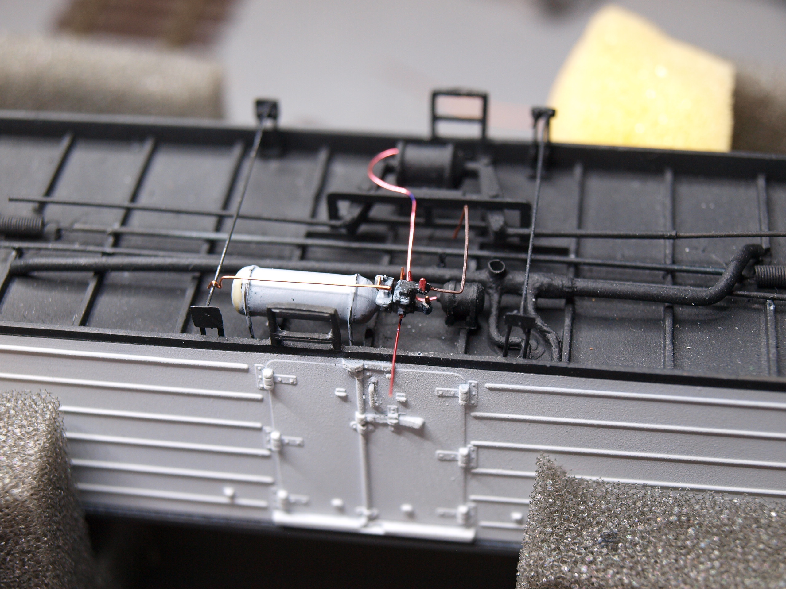 Snažím se nějak vykoumat tlakové rozvody mezi DAKO a všemi těmi ústrojími pod vozem. Taky ještě chci trochu přidat detaily na podvozek. Super inspirace je na této stránce: http://www.drehgestelle.de/6/wiege_drkuehl_gd54.html