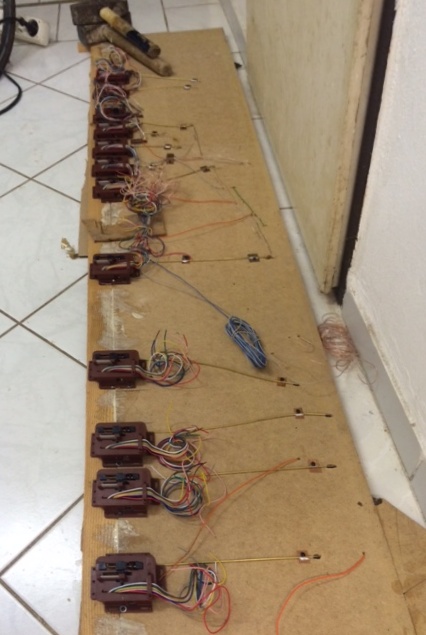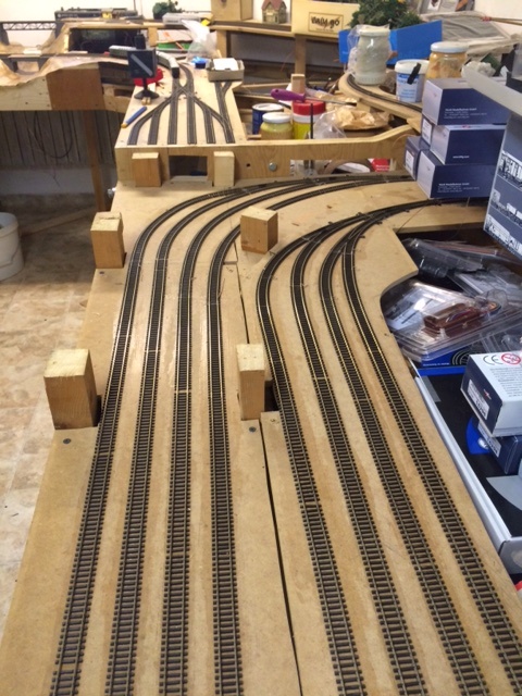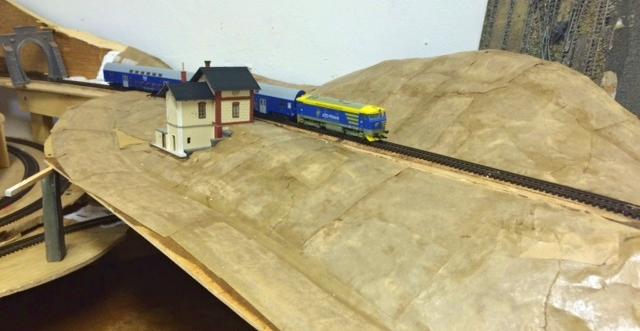 Podařilo se mi konečně částečně zprovoznit poslední stanici, když jsem namontoval přestavníky s táhly, zapojil srdcovky jak je výše uvedeno a konečně tak přilepil první kolej, po které lze stanici projet - musel jsem také směrově upravit část zhlaví a kousek koleje, aby to nebylo jak kozí dráha, aby to tedy bylo celkem rovné. Prostě rovné podloží překvapivě také rovné nejsou, takže klasická hřebíčková metoda posouvání a znovu přilepování.