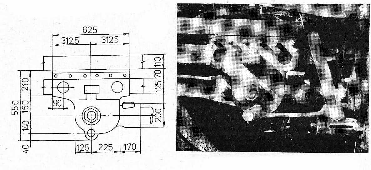 Pošlu ještě fotku pojezdu, skoro celý rám zakrývají kola a brzdové zdrže. Takže s rámem bych si nedělal starosti, jen nad něj umístit pružnice včetně té páté ve výřezu. Pamatoval bych na šikmé vybrání pro popelník, na fotce je vidět i spopelníkem těsně před hákem. A dole ten trojúhelník s naznačeným čepem pro brzdový hřídel.