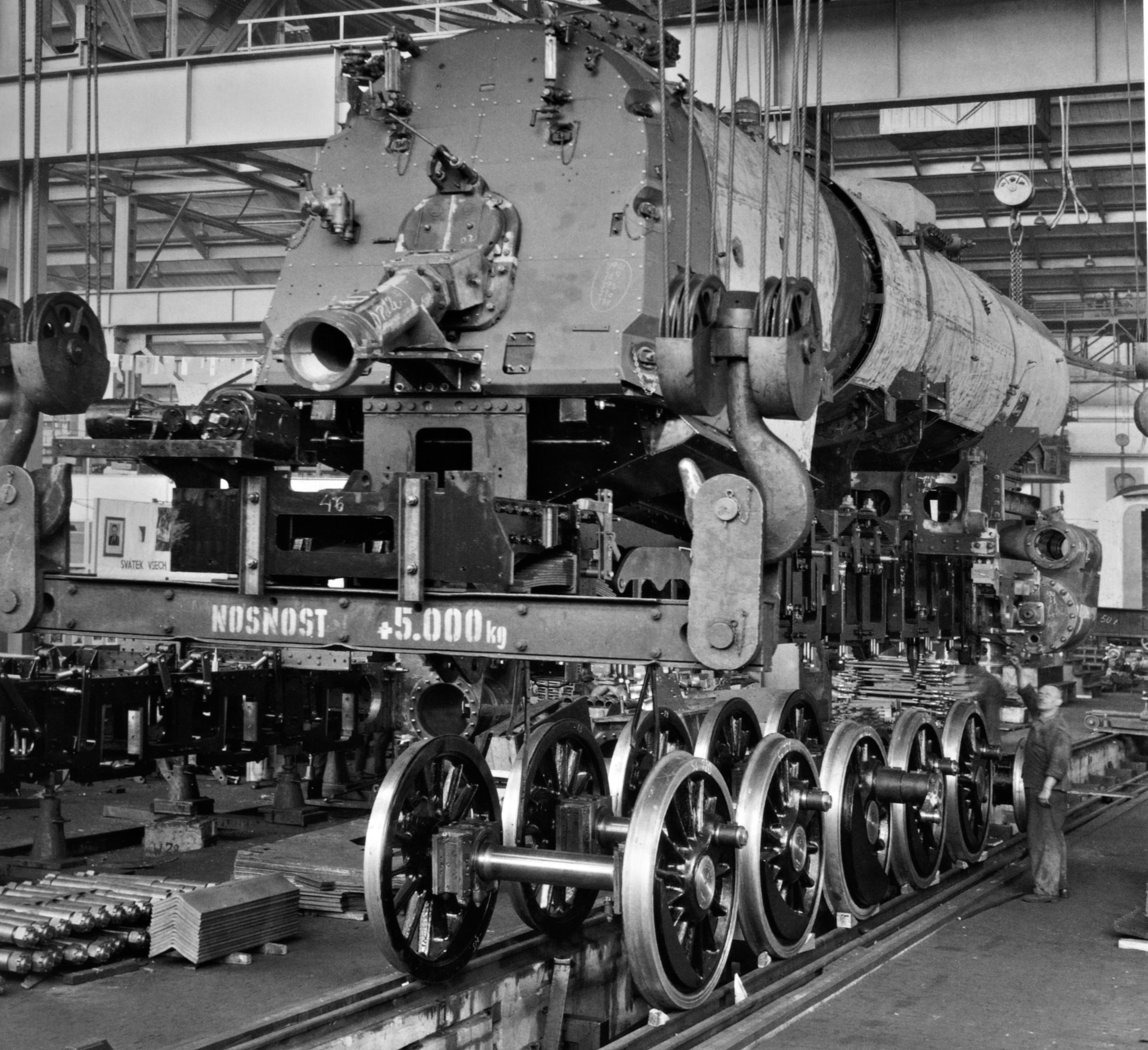 Na fotce se zavazováním náprav je trochu vidět, to co bývá skryto. Je třeba se zorientovat co je lokomotiva a co jeřáb. Když to vezmu od zadu, je tam zadní čelník se spřáhlovou skříní pro připojení k tendru. Dále se plechový rám rozšiřuje směrem dolů na svoji standardní výšku. Pod hrazdou jeřábu vykukuje zdvojený (stěna rámu je dvojitá) trojúhelníkový úzvar s otvorem. Tudy prochází převodní hřídel brzdy, převádí svislý pohyb od brzdových válců na vodorovný pohyb brzdových tyčí. Na horní straně rámu hned za čelníkem je opačně prohnutá pružnice, která pruží poslední nápravu. Ta je umístěna pod popelníkem a proto nemůže být pružnice umístěna nad rámem jako ostatní pružnice, ale je posunuta za nápravu. Převod zatížení od zadní nápravy je udělán "vahadlem", které nemá otočný bod, ale zadní okraj je spojen s onou pružnicí, střed zachycuje síly od páté nápravy a předek je spojen s vahadlem mezi čtvrtou a pátou nápravou. Na fotce je velmi dobře vidět, ale jinak jej zakrývá čtvrtá náprava. Vpravo před hákem jsou dobře vidět pružnice od čtvrté a třetí nápravy. Pod pružnicí jsou je v rámu výřez, kde jsou z obou stran přišroubovány kluznice, ty zapadnou do výřezu v nápravovém ložisku (jsou vidět na nápravách). Jsou tam také vidět opěry, které přenášejí zatížení z ložiskové skříně na střed pružnice. Vždy mezi výřezy pro ložiska se v rámu nacházejí otvory, kde jsou umístěny vahadla mezi pružnicemi. Mezi druhou a třetí nápravou vahadla nejsou, Jsou také dobře vidět závěsy (podpěry), které podpírají kotel a jsou protaženy ještě výše, aby podpíraly boční ochozy (lávky). Válce jsou přišroubovány k rámu, poté se výška rámu snižuje, rám probíhá nad podvozkem Kraus-Helmholz, kerý spojuje první nápravu s běhounem. Pod válci by mohlyy být trochu vidět vahadla mezi běhounem a první nápravou. Pružnice od běhounu je nahoře, ale nachází se ve skříni podpěry dýmnice, takže nemůže být vidět.No a nakonci rámu je přední čelník.