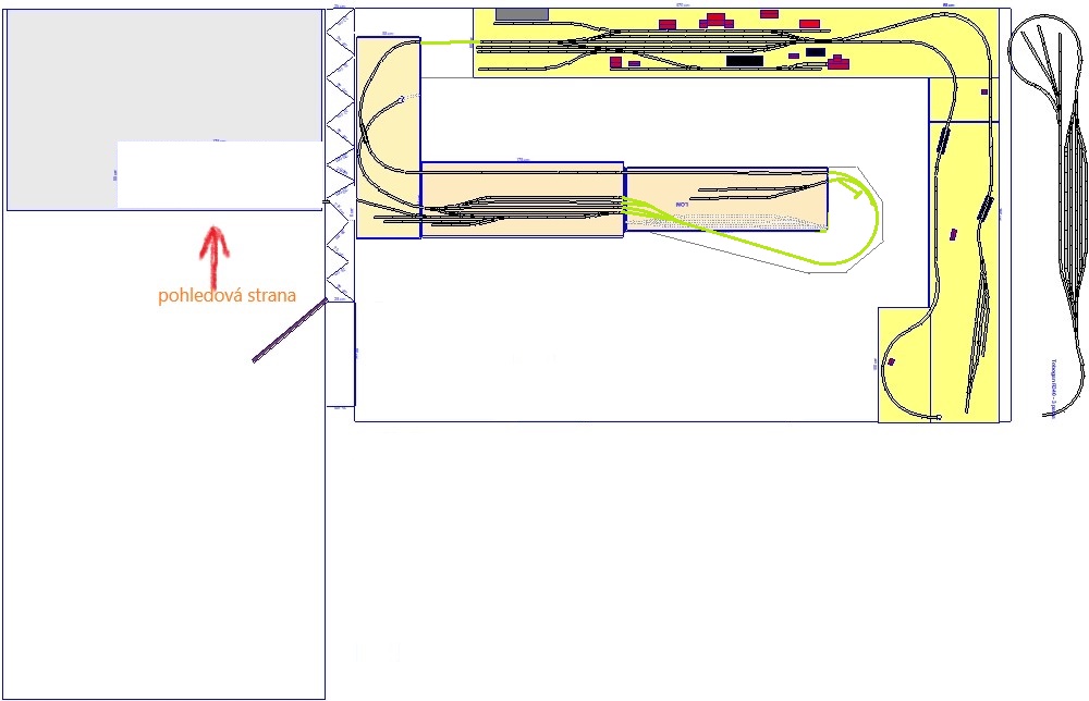 - žlutě podbarvené kolejiště zůstane v pravém horním rohu, jak je nakresleno (jinam se nevejde). Jediné co se může změnit, je levé ( z našeho pohledu) zhlaví, a koncové malé nádraží se může také zrušit, či modifikovat na průjezdné, či vlečkový areál. Na kratší větvi je tobogánem sjezd do SN s vratnou smyčkou, snad je to z plánku patrné
