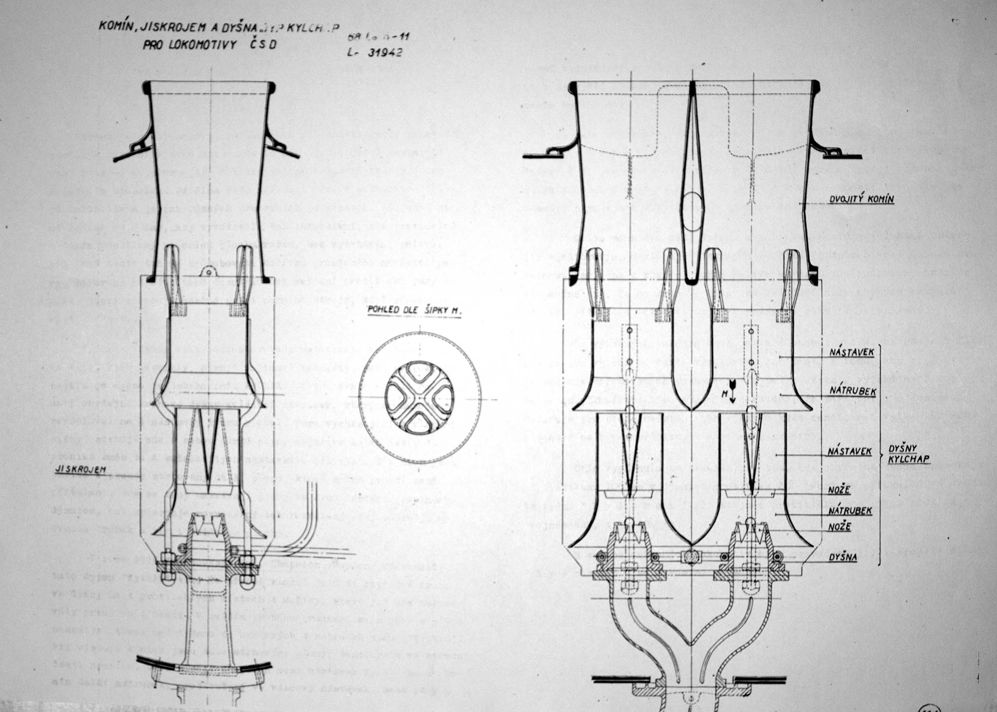 V příloze posílám výkres, kde je vidět obrys jiskrojemu našich poválečných lokomotiv s dyšnou Kylchap. Na druhém obrázku z Gieslovy Anatomie je vidět konstrukce a způsob otevírání jiskrojemu německých lokomotiv z konce dvacátých let
