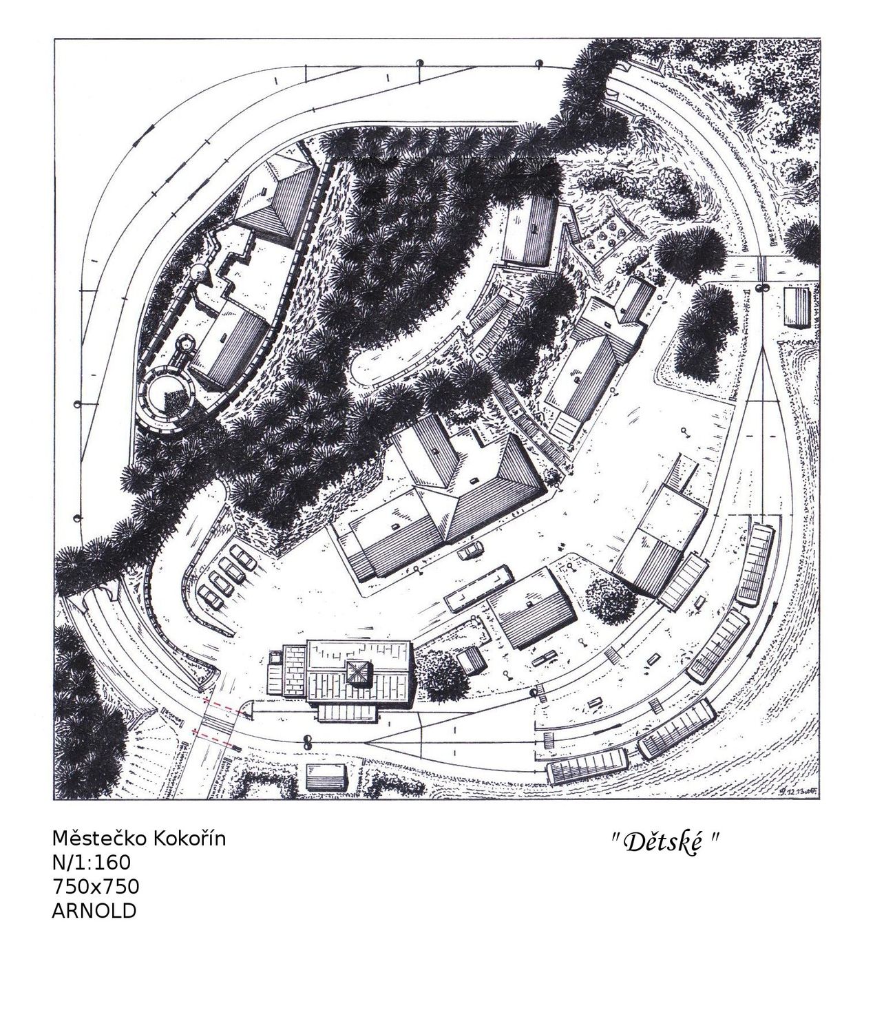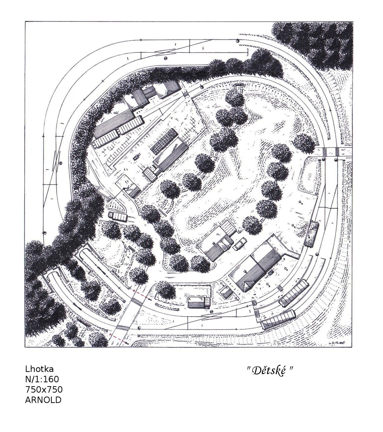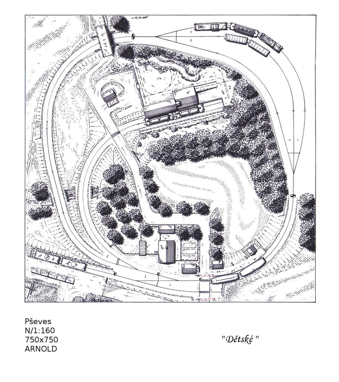 Kolejiste vychazeji z planku M. Ferdiana "Mezilehla" a "Koncova" (I. dil Planu kolejist) - ac jsou upravena. V "mezilehle" je odstranena jedna kusa kolej za kulisou; z "Koncove" se stal kruh (v zajmu detske zabavy). Velikost kolejiste je dana soucasnym uloznym prostorem, zvetsit nelze. V pripade "uspechu" a pokracovani krouzku i po dohotoveni kolejist se tyto napoji na pristi segmenty v casti za kulisou, pripadne se casem odepisi a predelaji.