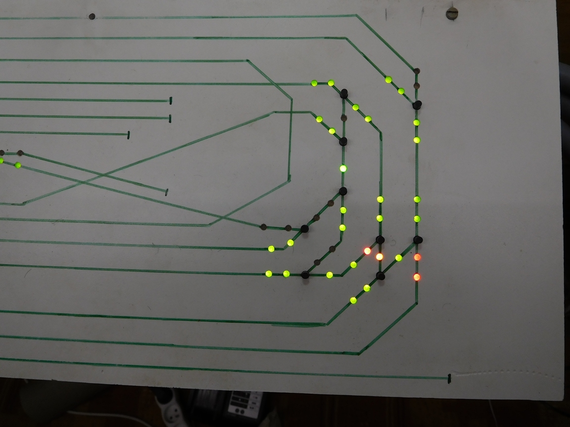Rozumiem co chcel naznacit Myspulin, ale tu sa nejedna o navest resp. o vlakovu cestu ale iba o "signalizaciu stavu vyhybky". T.z. ak je vyhybka nastavena priamo, smer priamo je vysvieteny na zeleno, do odbocky na cerveno. Ak je vyhybka do odbocky, tak je odbocka zelena a smer priamo cerveny - jednoduche a je jedno ci je smer od jazykov alebo na jazyky. Mam to asi presne tak spravene aku ma predstavu tomashlava. Dokonca ked som mal zapojene obidva cipy ledky, mne osobne sa to zdalo prehladnejsie, ak v niektorom smere svietila cervena a blizil sa vlak, vedel som ze je zle, teraz pri tej hustote vyhybiek obcas nieco prehliadnem.