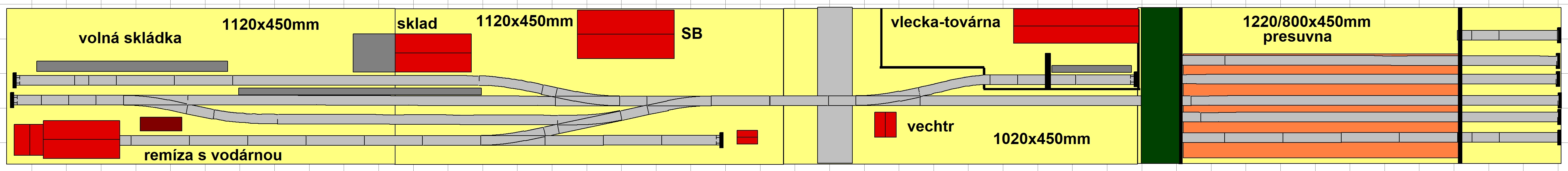 Ještě k přesuvně. Nahoru by se ti mohla vejít kusá kolej pro lokomotivu. Jinak budeš při objíždění ve skryťáku vyjíždět na širou trať...