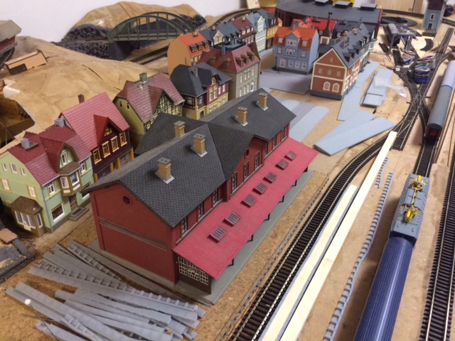 Hledal jsem využití pro tuto plochu u nádraží, uvažoval jsem nad průmyslem, polem a také samostatnými domy. Nakonec jsem se rozhodl pro městečko. K tomuto rozhodnutí jsem nakonec využil letité stavebníce Auhagen a malinko je poupravil či některé ze zbytků postavil, aby pasovaly k staniční budově Hronov a někde se domy na kolejišti objevily - taková vyhovující "sudetská architektura". Polabské domky od Igry by mi zde moc nepasovaly.