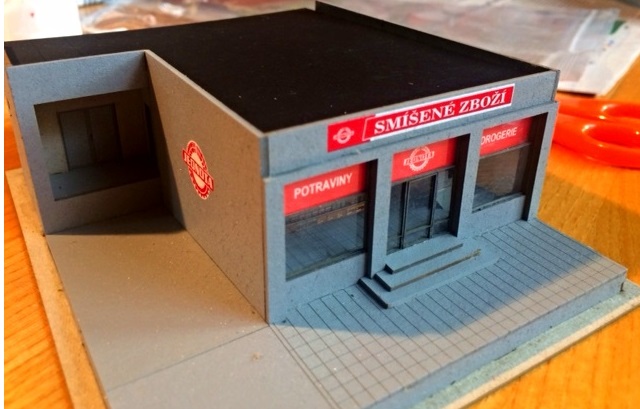 Ještě není přilepena střecha, vybavení prodejny také ne. Chybí osvětlení, komín, přidal jsem i pokladnu, ještě dodám i nějaký ten chladící pult a chtělo by to i postavičky a to prostě zde musím... :D Nějaká ta lavička, prostě klasika každé vesnice... :lol: