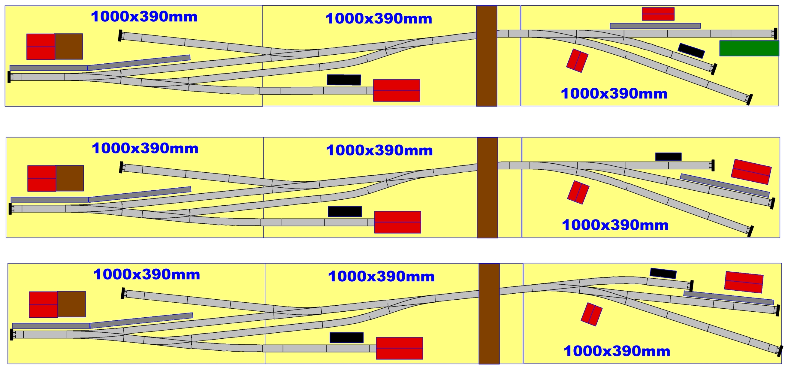 Nyní vás žádám o radu. Dejme tomu, že stanice na levém a prostředním segmentu je již OK. Stále mi ovšem úplně není jasné uspořádání na pravém segmentu. Zkusil jsem nakreslit 3 varianty. Na té horní by byla malá zastávka a motorák by dále mohl mizet za kulisou. Ty dvě spodní jsou jen alternativou malé koncové stanice s nákladištěm a strojovou kolejí pro lokomotivu. Nebráním se ani jiným návrhům na tomto segmentu a předem děkuji :wink: