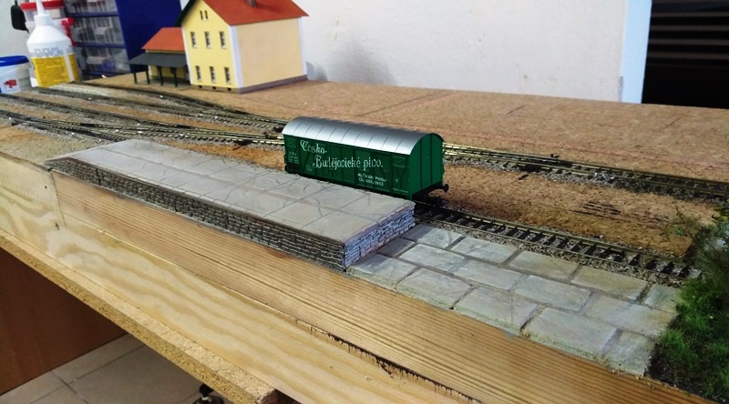 Rampa již vypadá trochu omšele. :wink: Hlavně se mi podařilo i zaštěrkovat komplet koleje ve stanici.