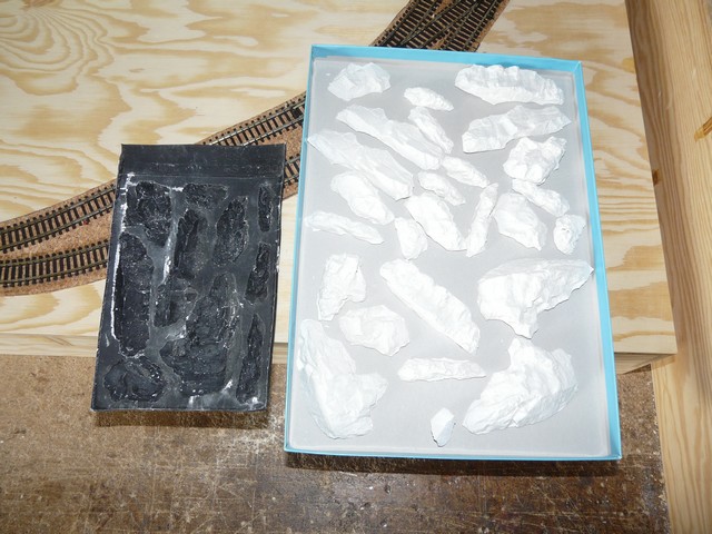 Pokud mohu poradit , tak ze sádry se dobře dělají skály v této formě. Následně kousky nalepíš kam je třeba , doladíš mezery trochou sádry a natřeš. Fakt pohodová práce a pokud chceš vidět výsledek tak koukni třeba na sólo pro hurvínka tady v kolejištích. Forma stojí okolo tří stovek a vydrží snad na věky. :wink: Ta moje je tuším z Modelscene.