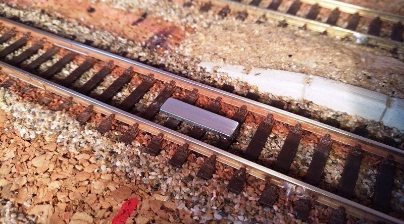 Mezi kolejnicemi je nalepený neodymový magnet 20x5mm. Na spřáhle vozu je ohnutá spodní část očka a na ní nalepený rovněž neodymový magnet průměr 2mm. Polarita magnetů musí být situována tak, aby se při přiblížení odpuzovaly. Při běžném přejetí soupravou bez zastavení se magnety díky síle působící na spřáhla nerozpojí. Musí se zastavit a někdy i mírně couvnout, aby se spřáhla uvolnila. Při spojování stačí najet na vůz a posunout jej mimo magnet. Očko spřáhla vozu se pak vlastní vahou /i díky váze magnetu/sklopí do polohy spojeno. Na lokomotivách nemám očka, pouze háky. :wink: