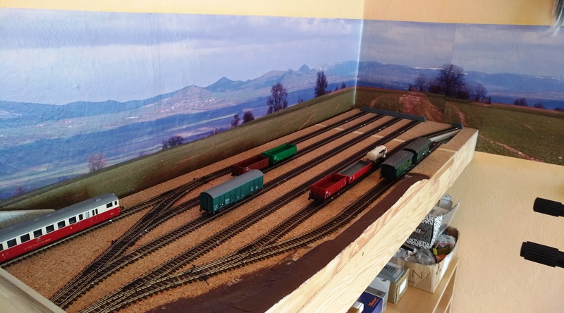 Přes vánoční svátky jsem si kolejiště dost užíval a zjistil jsem, že koncepce koncového SN se segmentovou přesuvnou /točnou/ mi provozně nevyhovuje. Využil jsem pracovního volna a došlo na úpravu SN, které nyní bude rozšířené o kousek viditelné tratě, tvořící část vratné smyčky. SN Bude za kulisou lesa a skal :wink: