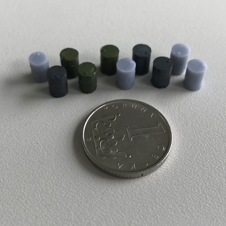První pokus... 200l barely nove a poskozene. Sede jsou ciste vytisky, barevne jsou jiz po povrchove uprave.