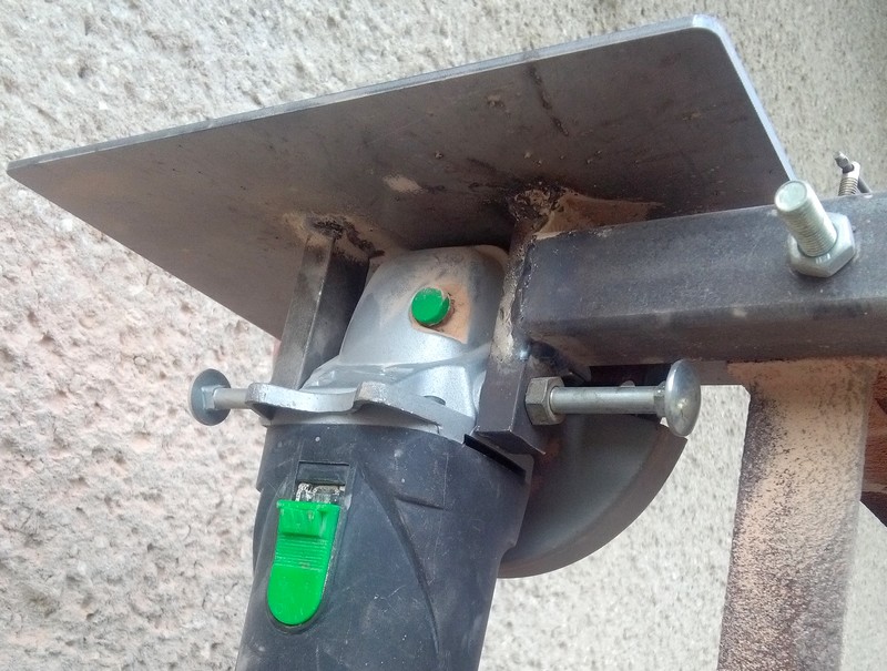 Je to nejlevnější flexa co jsem sehnal. Kotouč diamantový na řezání kamene průměr 125 mm. Stolek je vyříznutý z plechu tl.5 mm , pravítko z úhelníku 25x25x3. Ke stolku jsou zespodu navařeny dva plocháče a do nich je za závity pro rukojeť flexy bruska upevněna. V podstatě je to taková malá cirkulárka. :wink: