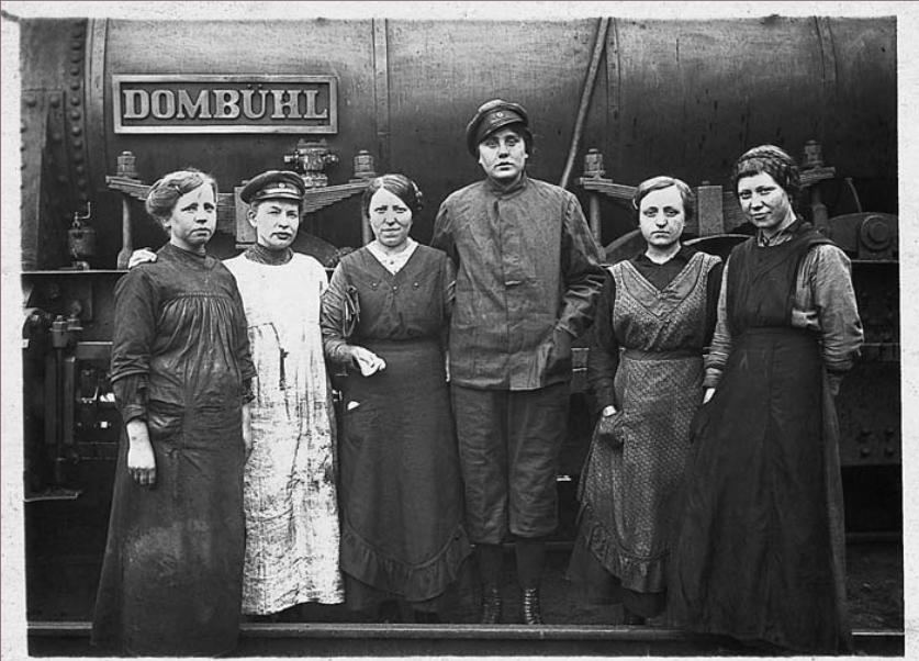 Takže: Fotografie byly nalezeny v pozůstalosti jednoho zesnulého bavorského strojvůdce. Je na nich parta čističek lokomotiv, jejichž rukama procházely všechny stroje přistavované k opravě do železničních dílen Würzburg. Přesné datování snímků není známo, ale doprovodný článek v Eisenbahn Journalu 9/2008 na str. 32 - 33, odkud jsem ty fotky vylovil, uvádí indicie, podle nichž je lze datovat zhruba do roku 1920.