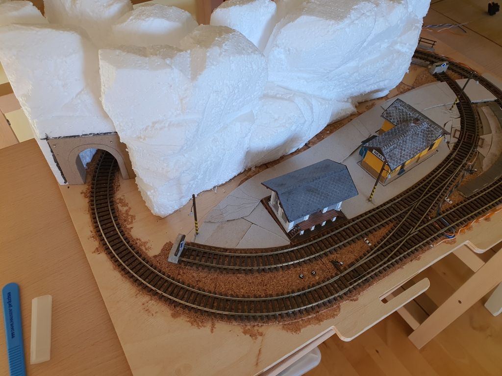 Dotvořil jsem silnici (potahovací stavební lepidlo), prostor nádraží (prach od Poláka v několika odstínech) a zahlinil, především před skalami.