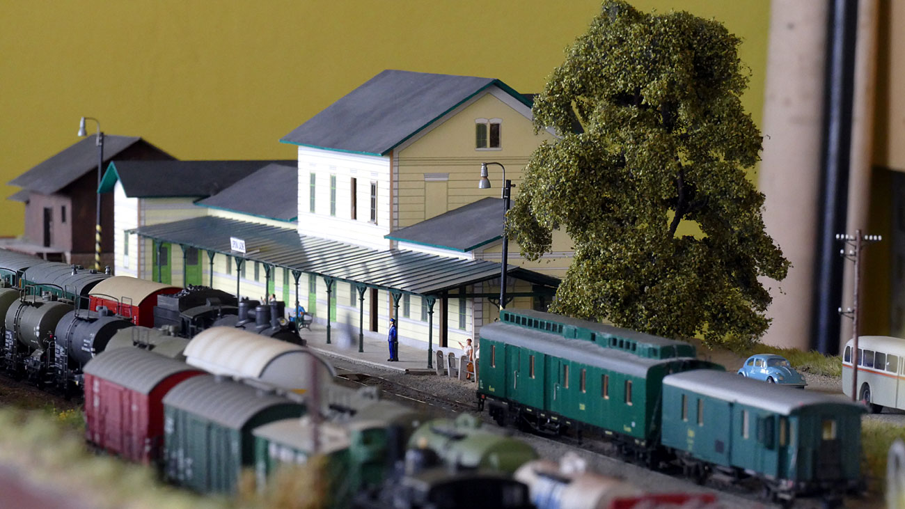 pohled z cesty za malou výtopnou, z hlediska rozložení je modulová stanice trochu jiná než skutečná - vložený 60 cm díl posunul staniční budovu o tuto vzdálenost od zhlaví proti skutečnosti a naopak jsou zkrácené vzdálenosti okolo skladiště