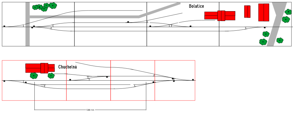 Jinak to překřížení kolejí bych volil jak v Bolaticích, tak jak to máš, to v těch stanicích nebylo. No a tu jednu dopravní kolej navíc, tak jak byla v Chuchelné, když z toho udělali přechodovou stanici, bych taky možná neviděl jako marnou.