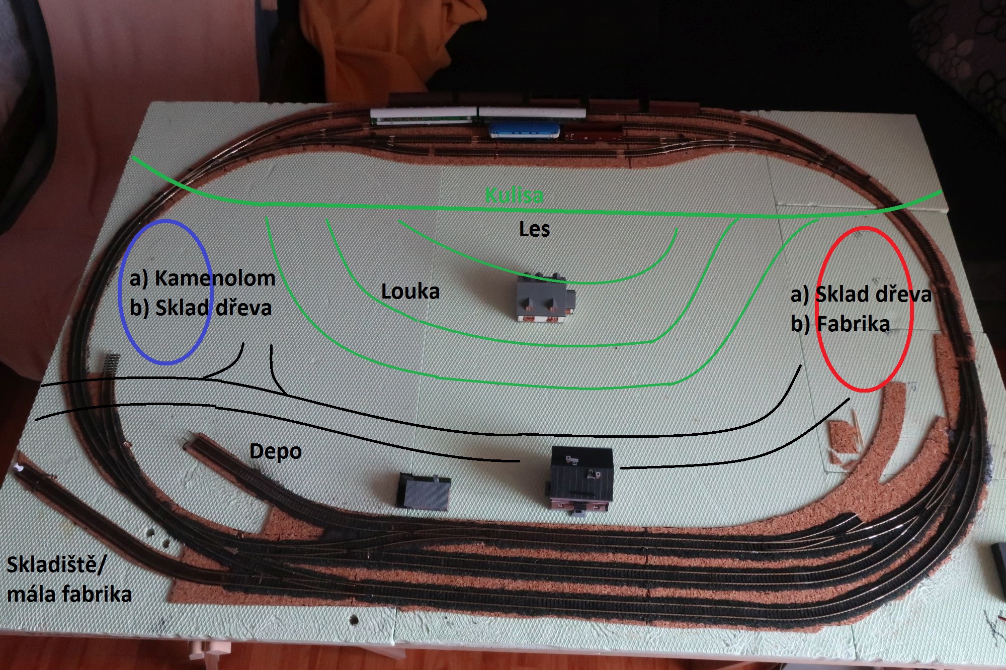 Díky za názory a rady (především za odkaz na "Sluníčko"). Překopávat kolejiště nějak šíleně nebudu, ale děkuji za usměrnění co se týče budov. Vpravo bude volná skládka na nakládku dřeva, vlevo drtička kamene a dole vlevo malé skladiště. Na kopci bude malý kostelík nebo kaple a pod kopcem jeden dům + drážní stavby.