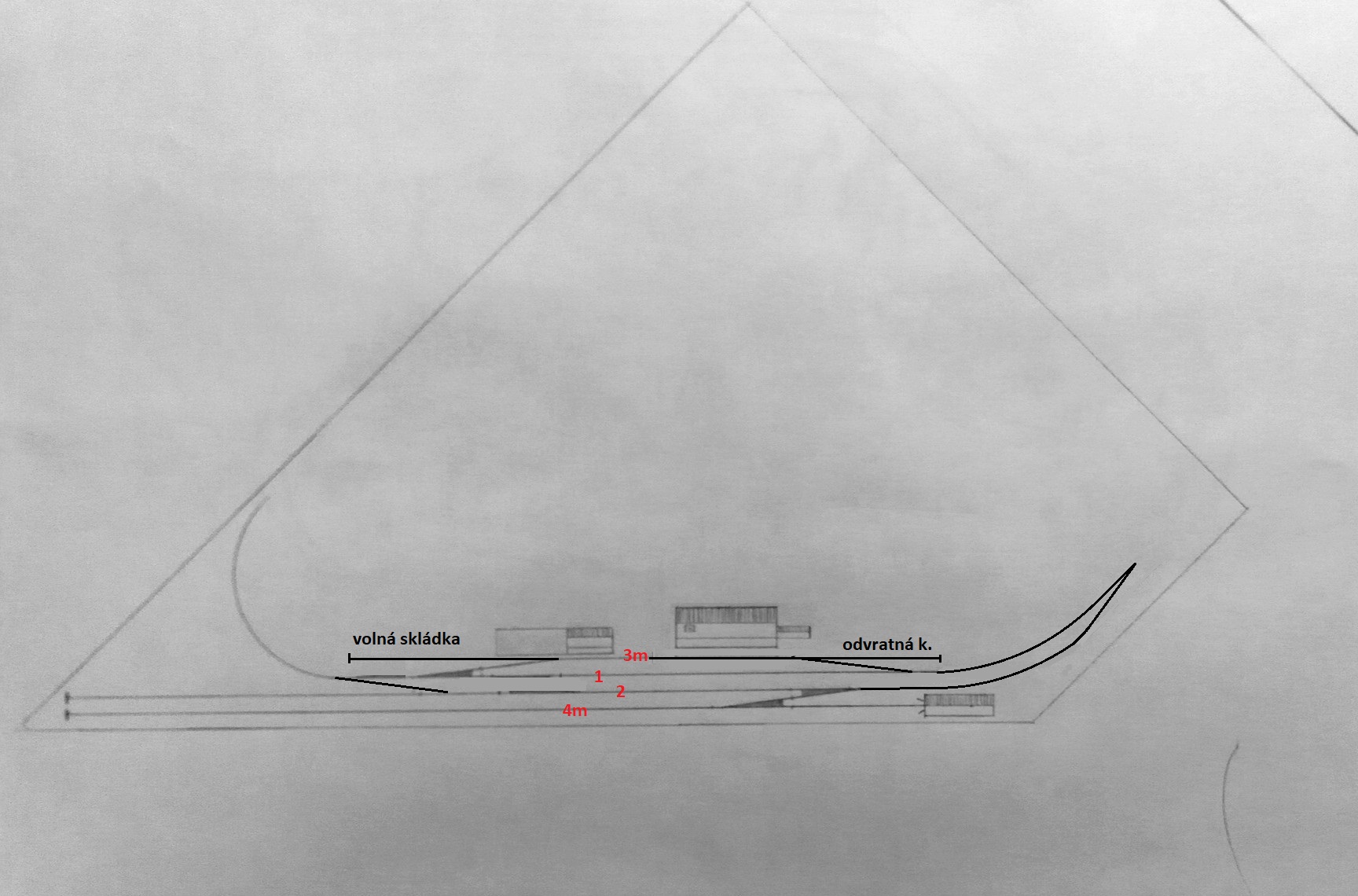 Tak som v praci len tak narychlo nakreslil bez presneho merania, pre predstavu. Ta remiza bude dalej, aby nezasahovala dokolaji. A prikreslil som tam nieco co ma napadlo - skrsla mi myslienka viest paralelnu kolaj a pouzit ju ako odstavnu. Moze to takto byt ? Mne by sa pacilo mat takyto plac kde mozem hodit mensiu supravu